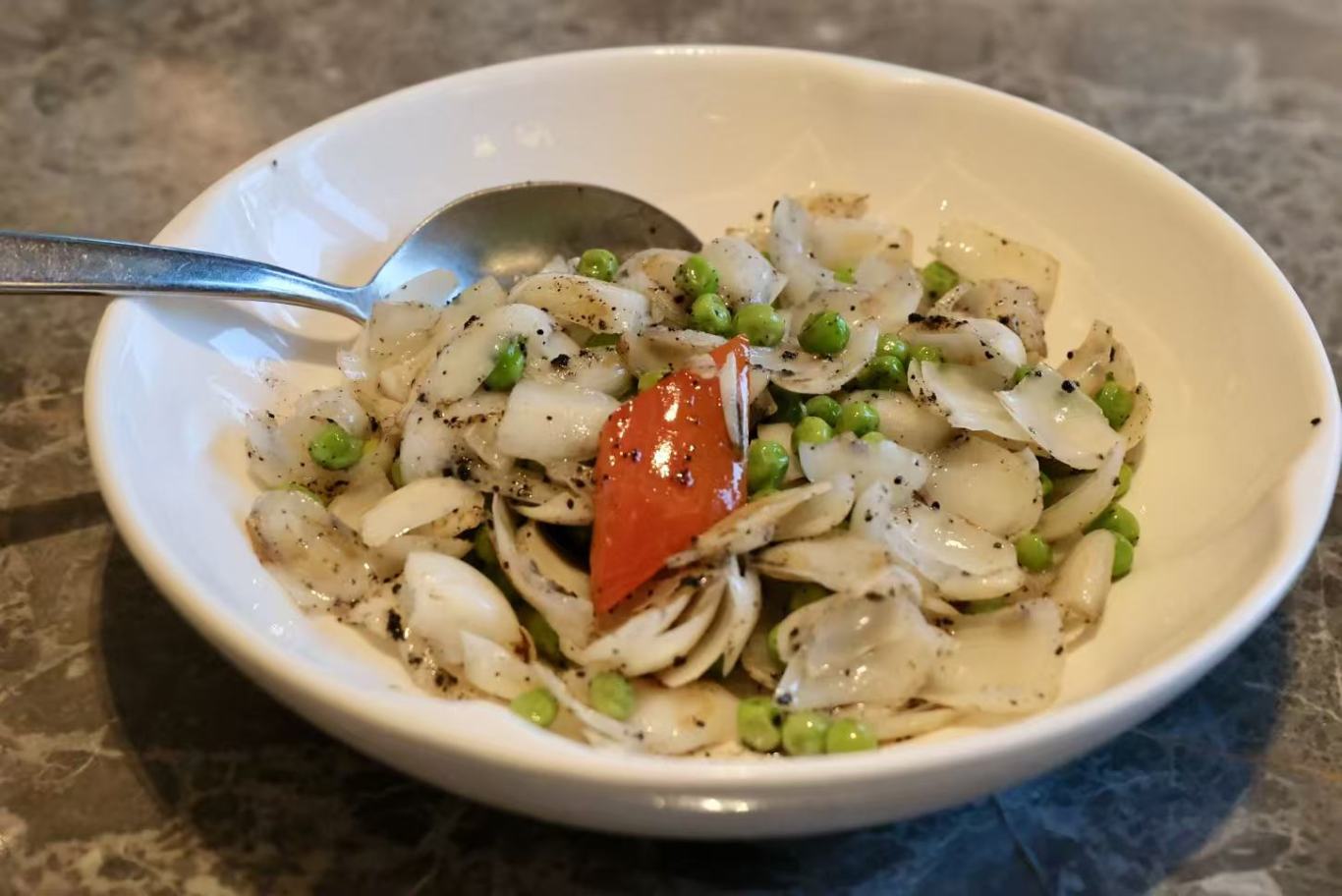 如果说春天有颜色,那一定是这一盘碧绿与莹白。百合的清香、豌豆的鲜甜、鸡头米的弹韧,三种时令风物在盘中相遇,清炒即是对它们最大的尊重。